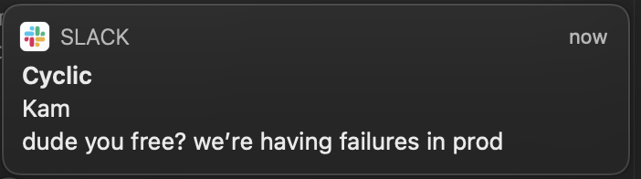 • "dude you free? we're having failures in prod."